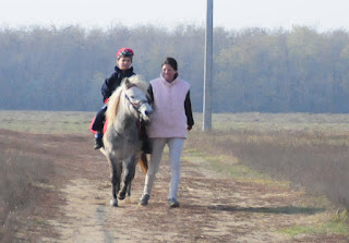 Utánam Nándi ment Angyalkával, de mivel sűrűsödött a lovagolni vágyók száma, így R. megkérdezte, kivinném-e Angyalkát és Nándit nagykörre sétálni. Persze elmentünk, Nándi nagyon jó kedvében volt, egyfolytában beszélt Angyihoz, aki persze érezte, hogy nem a gazdája tartja, így kihasználva az alkalmat, be-begyorsított. Én persze tartottam, húztam vissza, egyszer meg is álltunk, hátha sikerül a lelkére beszélni. Nem igazán hatotta meg a dolog... Az utolsó harmad táv bizonyult a legnehezebbnek, de ekkor már engedtem, hogy megálljon legelni, így gyakorlatilag fűcsomótól fűcsomóig mentünk. Hát mit ne mondjak, megizzadtam...
